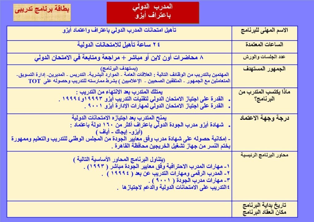 برنامج “المدرب الدولي” هو الأول من نوعه في العالم العربي، يمنحك اعتمادًا دوليًا رسميًا كمدرب معترف به في أكثر من 160 دولة أعضاء المنظمة الدولية للتوحيد القياسي (ISO).
